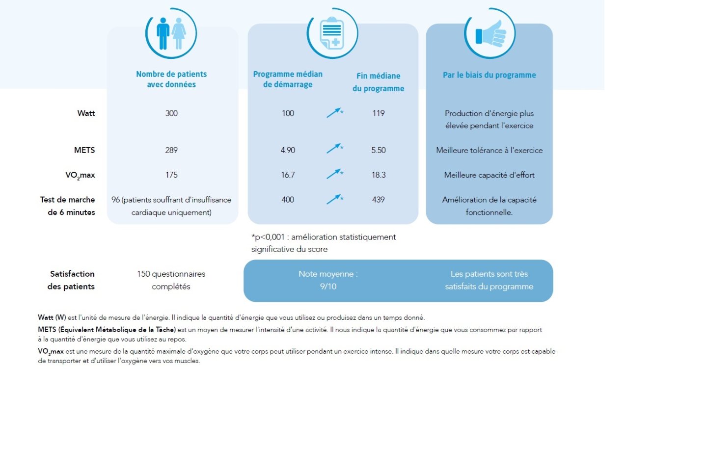 Grâce au programme de réadaptation, les paramètres médicaux se sont considérablement améliorés. Les données de l'AZ Sint-Maria (voir le tableau ci-dessous) montrent clairement que les patients qui terminent le traitement complet ont de bien meilleurs résultats à long terme.